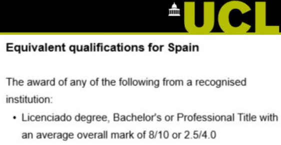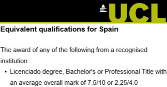 UCL硕士成绩:2:1学位 ; 西班牙本科成绩:总分8/10 or CGPA 2.5/4.0;