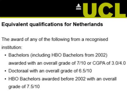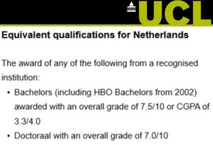 UCL硕士成绩:2:1学位; 荷兰本科成绩(包括2002年之后的HBO本科):总分7.5/10 or CGPA 3.3/4.0;