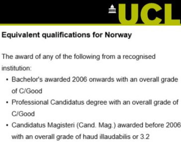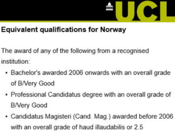 UCL硕士成绩:2:2学位; 挪威本科成绩:grae of C/Goo;