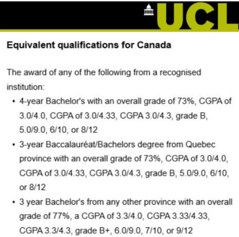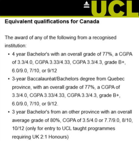 UCL硕士成绩:2:1学位; 加拿大本科成绩