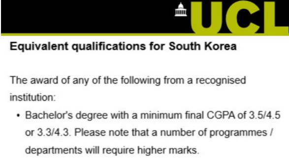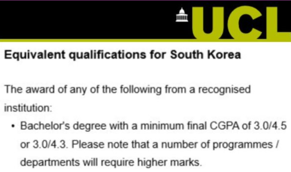 UCL硕士成绩:2:1学位; 韩国本科成绩:CGPA of 3.5/4.5 or 3.3/4.3;