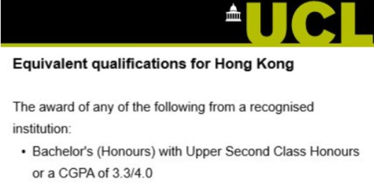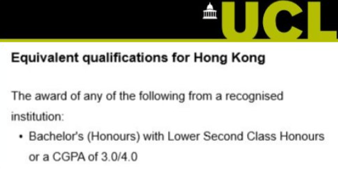 UCL硕士成绩:2:1学位; 香港 本科成绩:CGPA of 3.3/4.0 ;