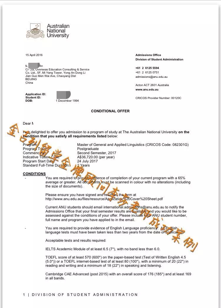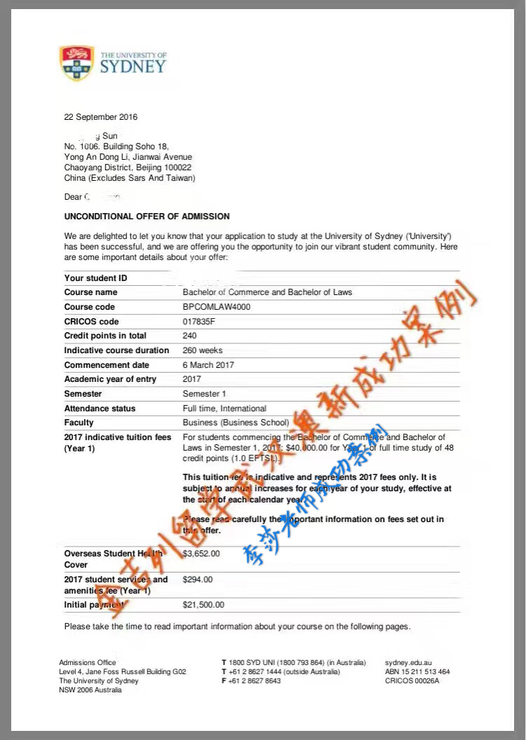 悉尼大学无条件录取通知书: