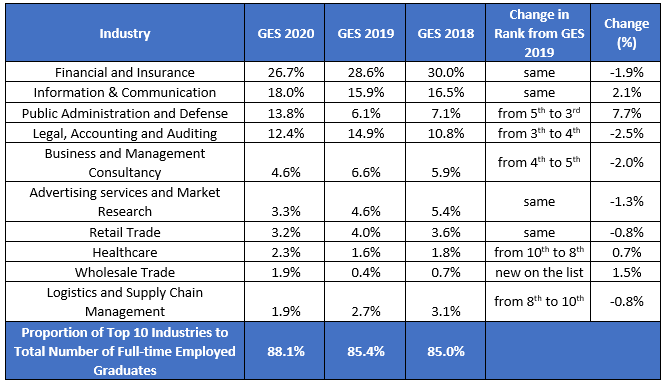 SMU 毕业生就业的前三名行业是“金融和保险”、“信息和通信”和“公共管理和国防”,其中“金融和保险”以平均月薪总额5,187新元继续成为最高薪酬的行业。