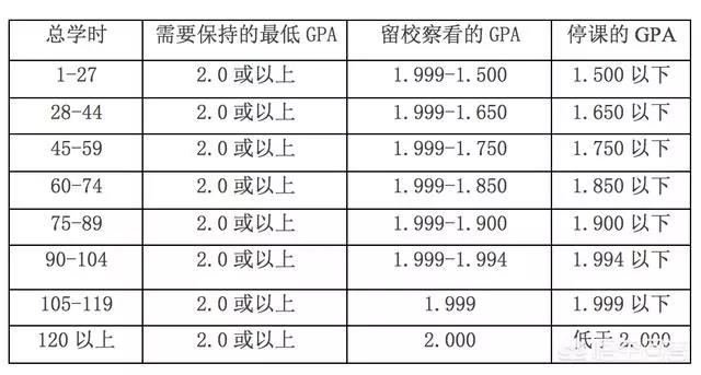 如果第一次低于GPA 2 但高于规定的停课数值(这个和总学时数有关,一般在1.5-1.9之间,详见下表) 一般先是留校察看(Acaemic Probation),这时每个学期的选课不能超过12学时,直到GPA追过2才能重新按每学期全学时选课(16学时或以上)。