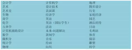 值得一提的是,外努伊欧玛塔高中向学生开放自主选课制度,9至10年级的学生除了修读英语、数学、科学、健康等必修课程之外,还可选修艺术类、科技类等众多科目。11至13年级的学生则可根据自身的兴趣爱好,以及未来的职业方向选择自己的学习科目,外努伊欧玛塔的选课范围也非常广泛,以保证学生们都能选到符合自身天赋与爱好的学科,具体类目包括: