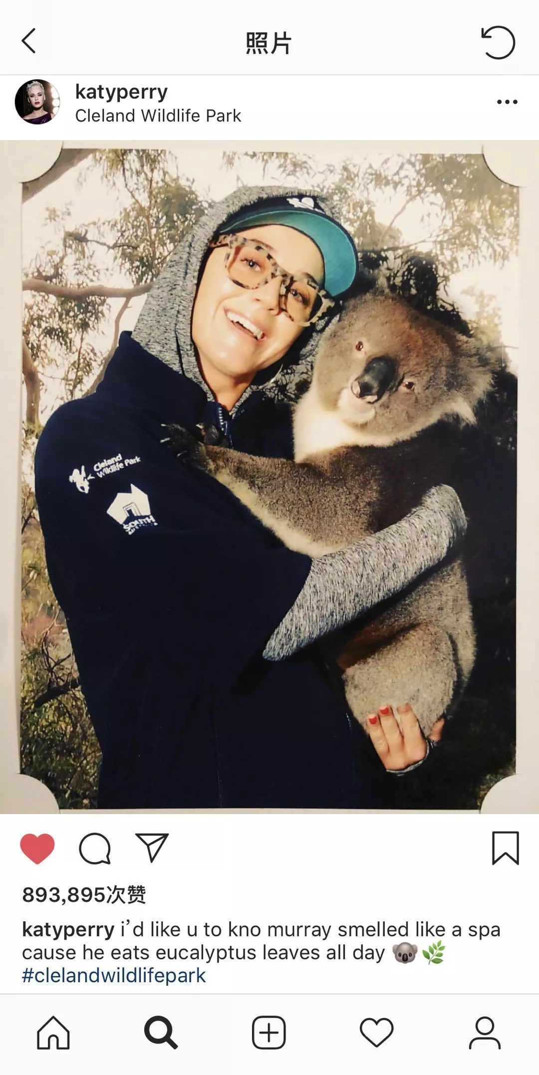 图片中,Katy Perry 来到了位于南澳大利亚州,阿德莱德山上的 克莱兰德野生动物园(Clelan Willife Park), 怀抱萌萌的考拉“默里(Murray)”,并评论道:“我希望大家知道,默里(Murray)闻起来像做了 Spa,因为它吃了一整天的桉树叶”,实在是很软萌又很有爱呀~