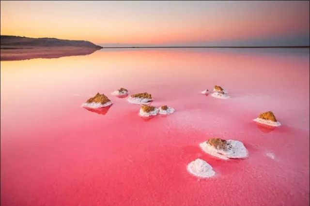 在每天上午和日落的时候,湖水的颜色又会异常粉嫩。根据这些因素,粉红色盐湖的湖面颜色可以从泡泡糖粉色跨越至浅紫色,让你的少女心充分被满足。