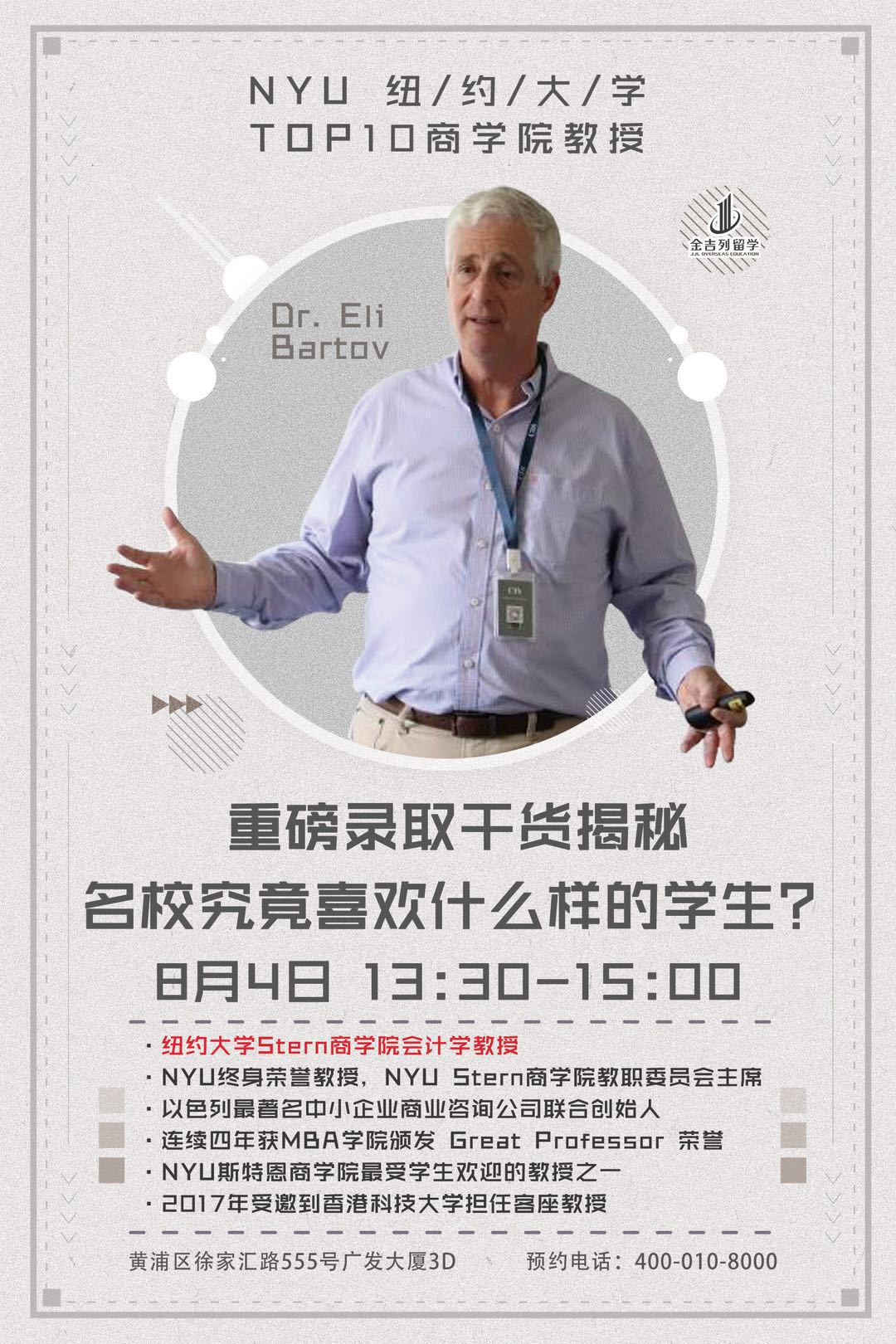 本周六下午,金吉列留学上海分公司有幸邀请到纽约大学Stern商学院终身教授Dr. Eli Bartov为大家揭秘NYU,究竟喜欢什么样的学生?在纽约大学Stern商学院读书是怎样一种体验?