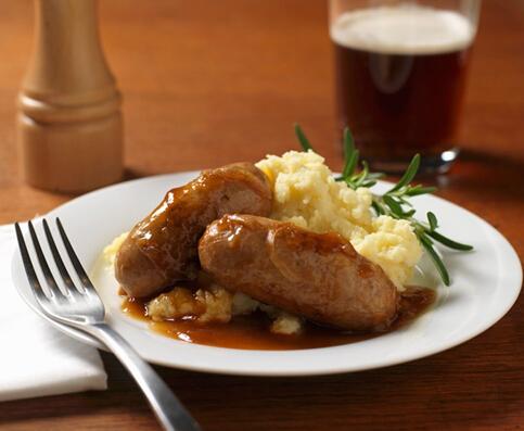 英国酒吧点单率极高的一道菜,几乎每家都有,是香肠和土豆泥( sausage an mash )、香肠主要以湖区特产的坎伯兰香肠( Cumberlan sausage )为最佳选择。通常一份是 3 根香肠铺在大量土豆泥上,或是一长条的绕成圆圈的香肠。因为土豆在英国被看作是主食之一。然后淋上相当于英国“耗油”的洋葱牛肉汁( Gravy )。也有的地方,配合当地的特色,加入了派( Pie )或布丁。这道菜的特点是非常管饱。但不像鱼和薯条那样细腻。几乎所有的英国酒吧都会做这道菜。价钱 5-10 英镑不等。品尝这道菜的最佳地点是湖区和布莱顿。因为前者以香肠出名,而后者以土豆泥出名。