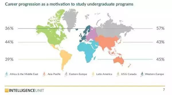 其中本科和研究生阶段出国留学是追求文凭,博士阶段则是为了学术上的成就。此外,东亚地区的学生,出国原因更多是职业( 43%)及兴趣(41%)。