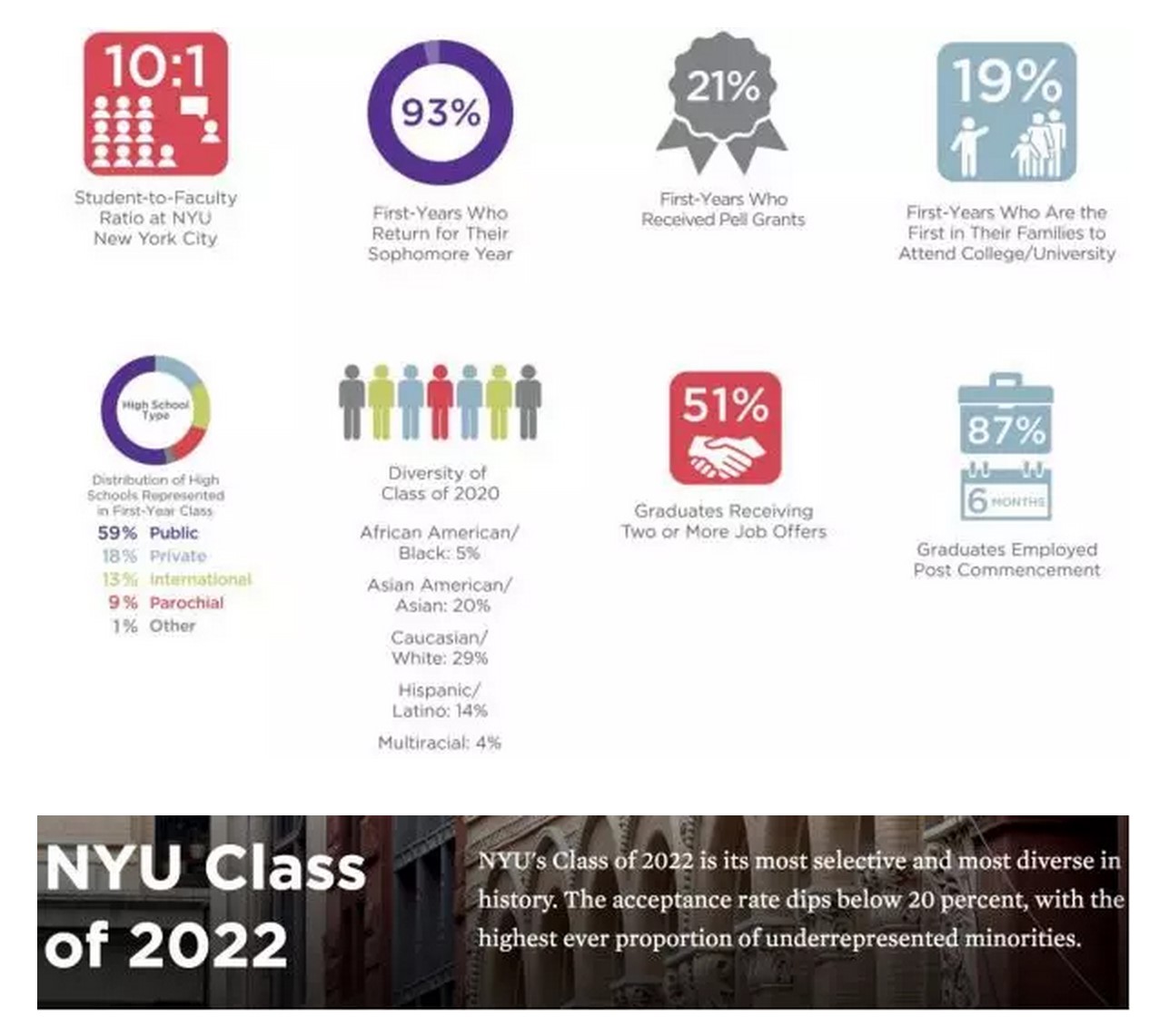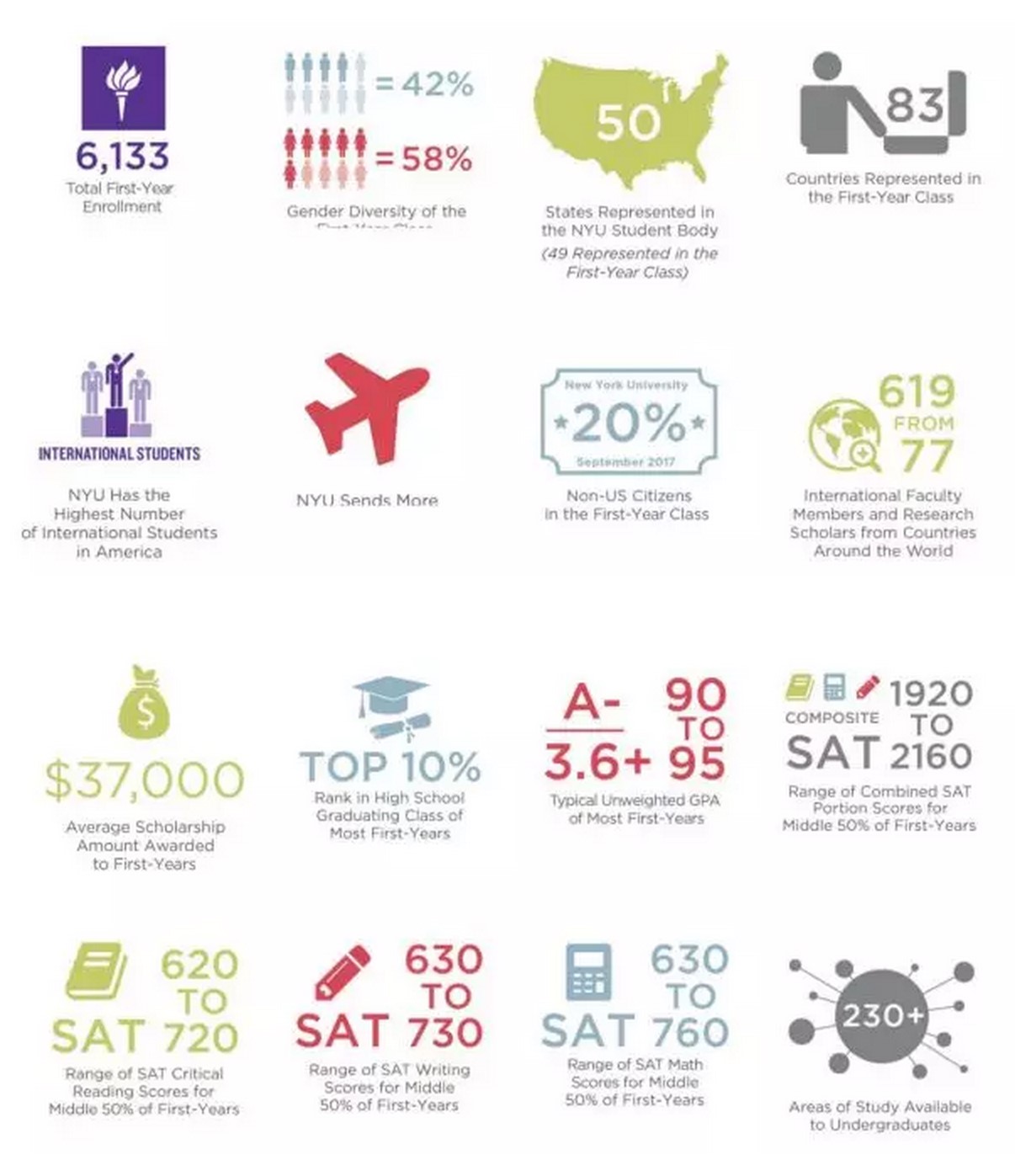 下面分享的这些数据大家需要注意了!这是 NYU 根据前一年的录取统计出来的录取比率,学生分布以及标化成绩区间等等。需要注意的是, NYU 明确表示今年录取的这一届学生是历史上最多元化和选拔最严格的一届,录取率已经降至 20% 以下。这个趋势对于之后想申请的学生可以是个警示或提醒吧,大家需要更加努力啊!