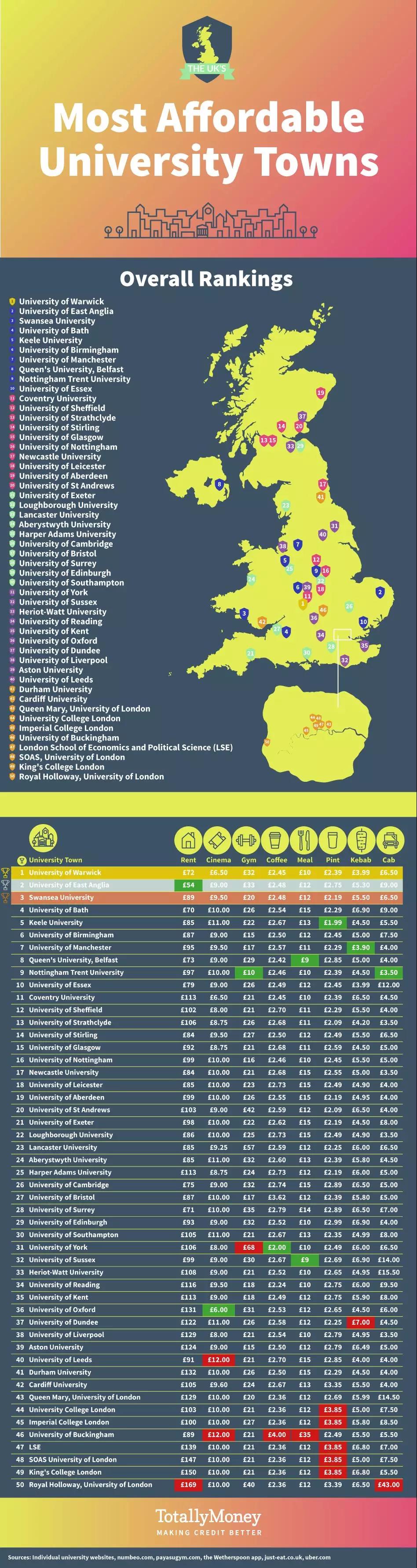 Totally Money前几天发布了最新的调查数据,评选出了英国50座生活成本最低的大学城。