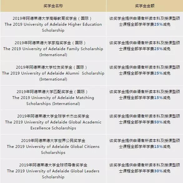 - 奖学金具体条款及条件请参照阿德莱德大学官方网站: https : //international.aelaie.eu.au/amissions/scholarships
