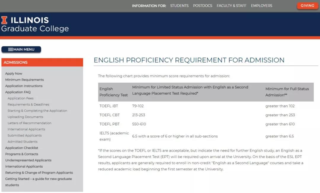 伊利诺伊大学香槟分校 商学院研究生项目托福的最低分数在100到105之间。被录取的学生托福平均分是108-112分。工程学院、文理学院等热门专业的被录学生托福在103分以上,如果是79-102分之间,可以有条件录取。