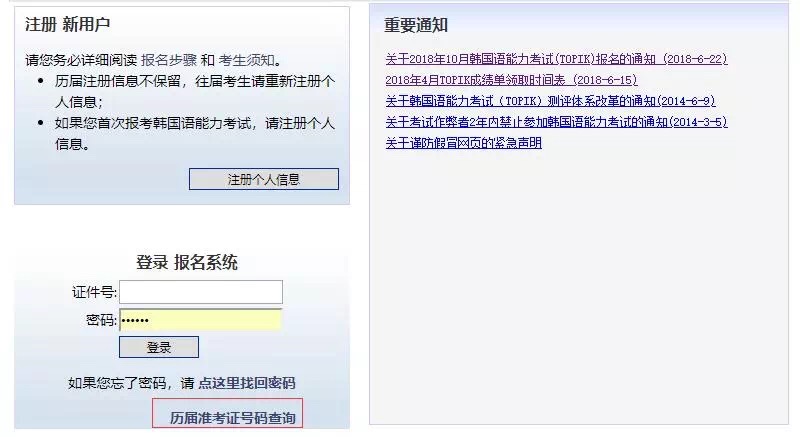 用自己的用户名和密码登录韩国官网 http://www.topik.go.kr 可以直接查询成绩,无需 准考证号码。用户名和密码也忘了,那么只能在官网论坛上发帖留下自己的姓名 ( 英文 ) 和出生日期,参加的届数和级别后耐心等待官网工作人员的回复。