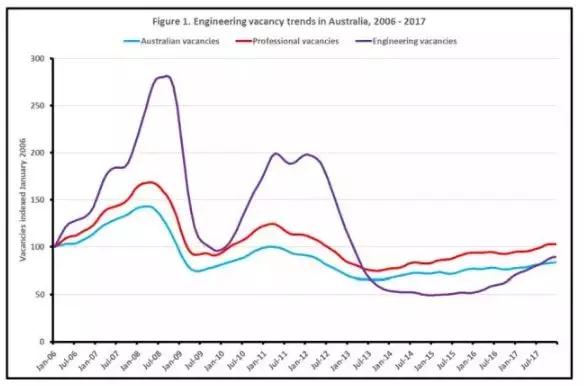 在2012年-2016年期间,澳洲的工程趋于饱和,但是自17年以来, 澳洲工程类专业的空缺状态回升了!
