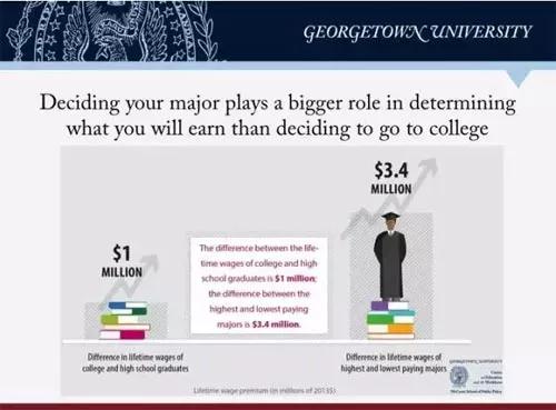 不同专业,毕业薪酬有一定的差距。 根据乔治城大学的数据调查显示,美国大学选择不同专业,一生赚的钱可能相差 340万美金!