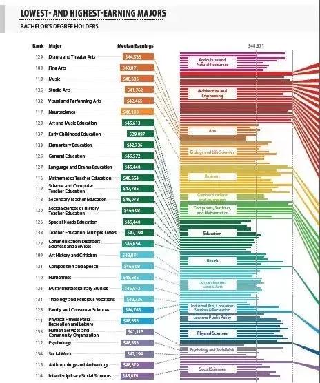 在这 137个专业中,排名垫底的专业为教育、艺术和社会工作类专业。两者收入差距极大。当然, 这里面数据是一组平均调查数据,影响毕业生的就业前景或薪酬水平的因素有很多 ,比如,即使是同一专业,不同水平的毕业生,其薪酬也会有很大的差距。