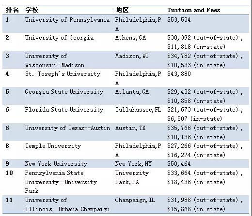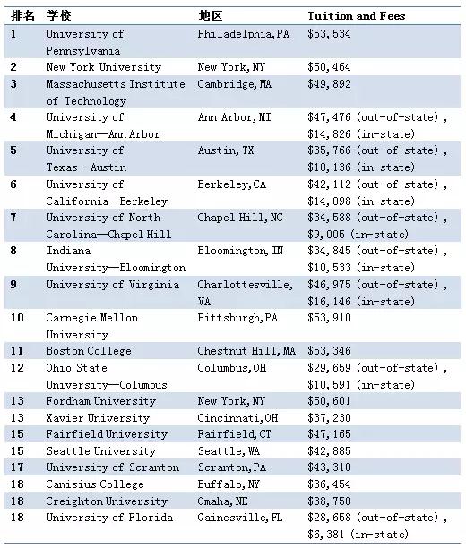 2018年USNews美国最佳本科金融