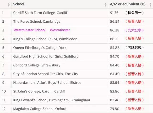 不出所料。卡迪夫大学依然还是榜首。赫赫有名的“九大公学”中,以威斯敏斯特公学(Westminster School)的表现最为抢眼,A-A*率高达86.38%。