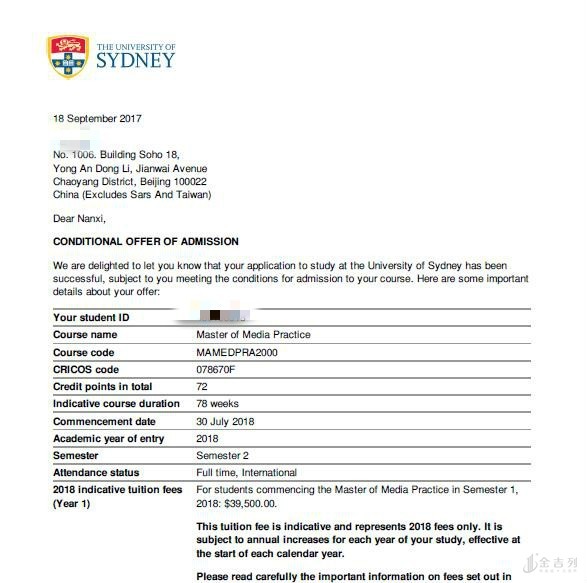 三、申请思路及专家分析 澳洲大学都是先到先得,考虑到l同学的gpa刚过悉尼大学的录取线,而且是择优录取,所以gpa不是很占优势。解决思路如下: 第一:让学生填写了金吉列专业文书信息表,我们的文案中心给学生写了两封导师推荐信和一个个人陈述。提升了学生软背景,解释了学生为何选择转读传媒硕士。 第二:考虑到学校申请是先到先得,所以在学生大三还未结束,还不能提供六个学期成绩单做申请时,就先用学生的护照信息给学生预约了位置,后补材料。 第三:学生雅思写作分数不高,可以先不提供雅思成绩,先用学术背景申请,然后等拿到有条件offer之后,等2018年4月再补交雅思成绩单,给学生缓冲的机会。 经过我们文案老师的材料制作、整合与包装之后,学生在递交申请的第三天就拿到了悉尼大学录取offer。非常感谢l同学对金吉列的信任,也恭喜l同学能去到心仪的大学。我们都说,出国留学很容易,然而去到真正心仪的大学不容易,学校申请文书的撰写和包装在申请过程中起到很大的作用。专业的留学,需要交给专业的留学团队去做。