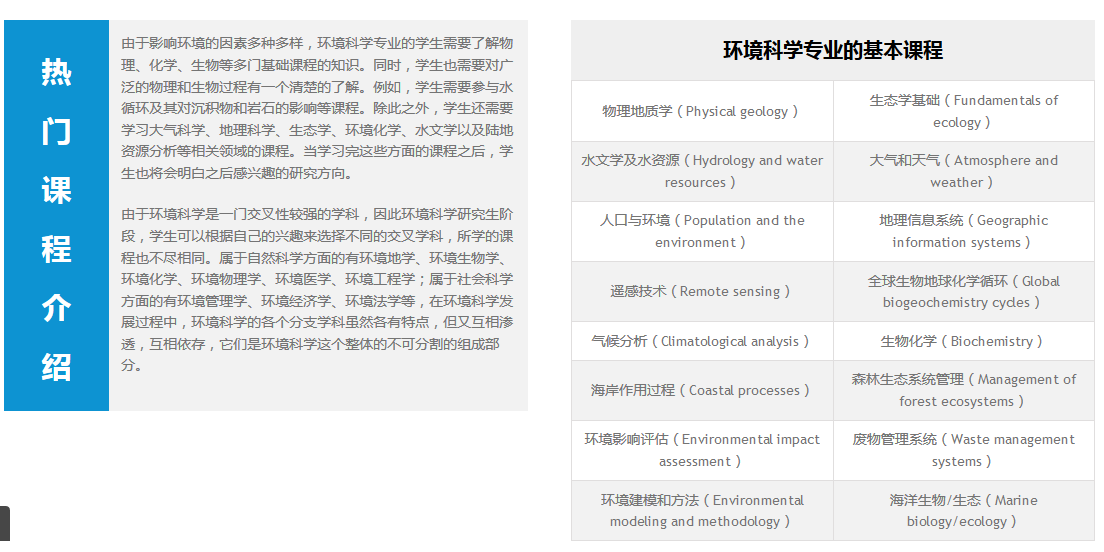 环境科学专业由大气科学、地球科学、环境化学、生态学等多个子领域组成。大气科学主要研究地球的大气层及与其他系统之间的相互关系,包含了对气象学、温室气体现象、空气污染物的扩散模式、光污染的研究。地球科学包括环境地质学、土壤环境科学、水文学、海洋性等。环境化学是环境科学的化学研究分支,研究领域包括土壤污染和水污染。生态学是指运用相关领域的环境科学知识对生态系统进行分析和研究。