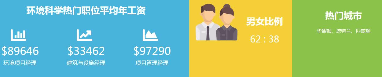 美国环境科学专业的毕业生部分进入研究生层次继续深造之外,部分进入各级环境理论研究机构和生产部门担当研究或咨询人员。在大气、海洋、交通、工业、农业、医学、军事等领域均有广泛分布,包括境管理及保护、政府及大学研究工作、环境顾问、环保机构、推广环保教育、生态保育及植林工作、燃油工业以及多个政府部门如:环境保护、水务、农业渔业部门等。环境科学专业的研究人员从事环境科学研究、环境监测、评价、管理和规划等工作,环境工程师从事环保产品的开发或者环境工程的规划、设计和管理等工作。