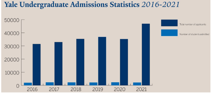 耶鲁大学总录取率为4.6%,去年总录取率为6.54%,申请人数为46,905,比去年增加了33%,录取人数为2,169,其中早申请批次已经录取了837名学生(早申请录取率为10.5%,早申请人数增长38%)。如果单论常规阶段,耶鲁的录取率为3.42%,与早申请录取率差距明显。