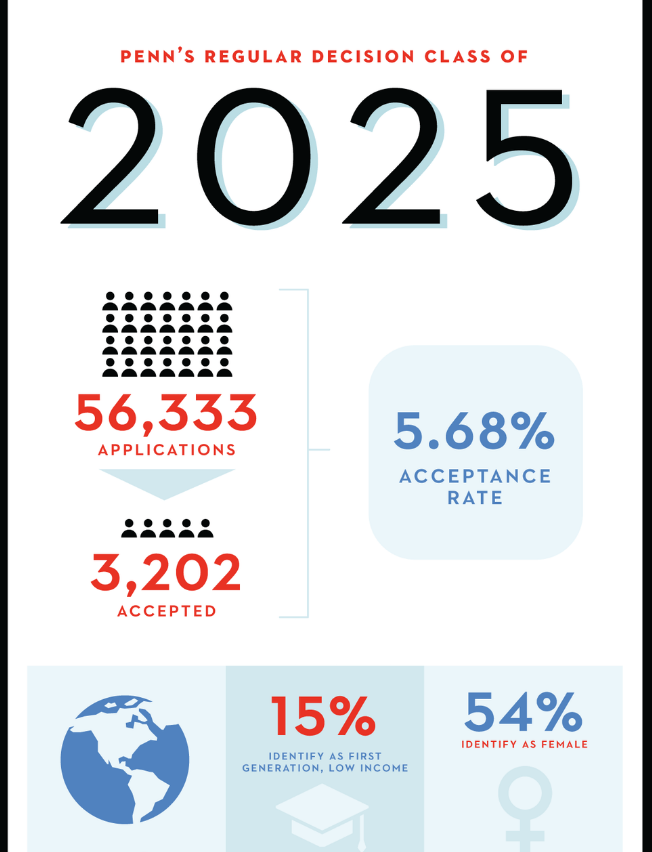 早申请阶段宾大的申请人数实现24%增长,现在把常规阶段的数据并入,宾夕法尼亚大学申请人数增长了34%,达到56,333人!其录取率在去年罕见的上升到8.07%,今年则回归到下降的大趋势,总录取率为5.68%,共录取了3,202名学生,国际生比例为11%,比去年的14%减少。