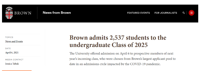 去年有36,794名学生申请了Brown,录取了2,533人,录取率6.9%。另外,布朗大学也是施行test-optional政策,但学生可以通过提交两分钟视频或Common App新增问题来分享自己疫情期间的挑战和影响。