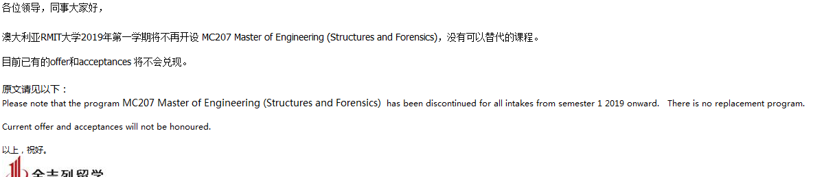 早晨接到澳大利亚RMIT的校方通知,学校2019年第一学期的MC207 Master of Engineering (Structures an Forensics)专业不再开课,并且没有可以替代的课程,这个消息是第一时间发到我们公司的,再次也提醒大家,如果申请的是这个专业方向的,目前已有的offer和acceptances 将不会兑现,要尽快更改自己的方向,并再次申请,其他具体的问题可以直接联系我来给你们处理,欢迎咨询,下列是邮件原文,大家可以看一下!!!