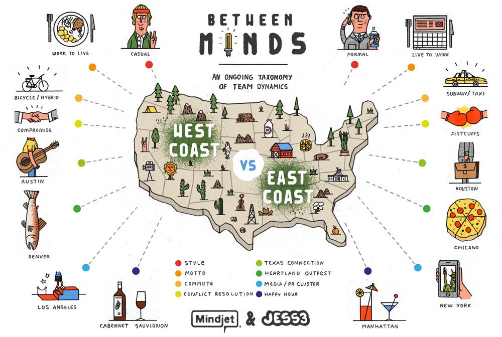 关于 Mark Zuckerburg 的小插曲在两海岸间创造了媒体风暴,他们讨论东西部的陈规旧习,并想得出一个正确的观点。如果你让美国人描述一下来自东海岸或西海岸的人,对于同样的陈规你常常会听到不同的答案。