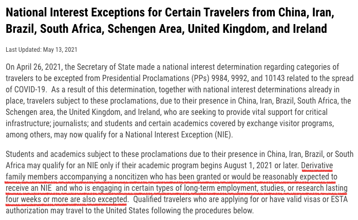 而在5月13日,美国国务院再次对4月26日政策进行补充,允许符合条件的来自中国等地的学生、访问学者等直系家属也获得国家利益豁免(NIE)资格,无需第三国14天隔离即可直接赴美。