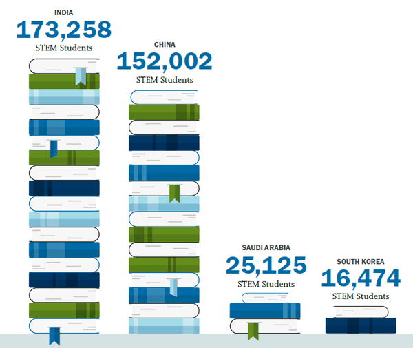 STEM 学科留学生大部分来自亚洲,特别是印度、中国、沙特和韩国这四个国家。