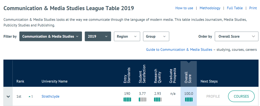 因为思克莱德大学的传播与媒体专业在2019年完全大学指南(complete university guie)排第一!!!!!