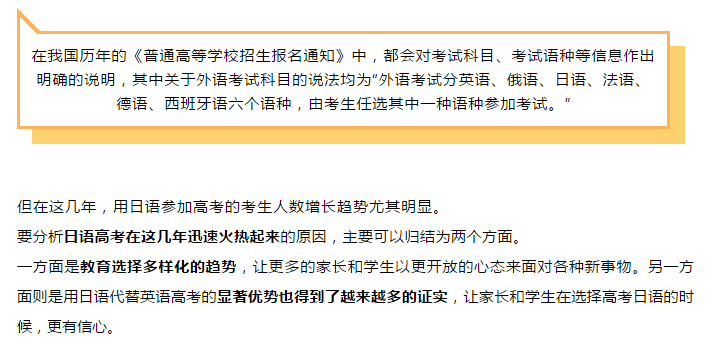 所以,为什么越来越多人选择用日语参加高考呢? 其实关于“日语可以代替英语来高考”的政策,并不是这一两年的高考新政,而是已经稳定实施了十几年了。