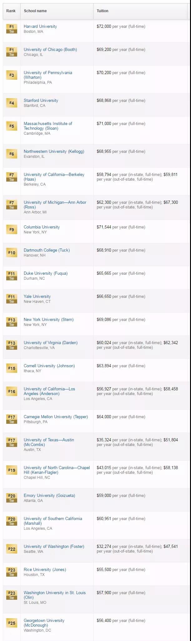 附: 2019U.S.News最佳研究生商学院TOP25榜单