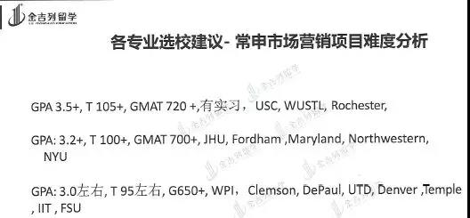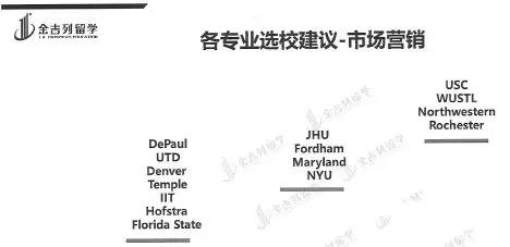 在美国Top 100的院校当中,直接开设Marketing项目的只有21所,招收中国学生的院校只有约14所左右,主要分为以下几个大方向: