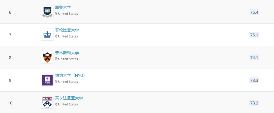 第四名是加州大学伯克利分校UCB,令人惊讶的是第五名由去年的哥伦比亚大学变成UCLA。之后耶鲁大学排在第六、哥大位列第七、普林斯顿大学位列第八。宾夕法尼亚大学相对去年后退两名,勉强保住了前十位置,而纽约大学NYU争气地挤进Top10,拿下第9名好成绩。