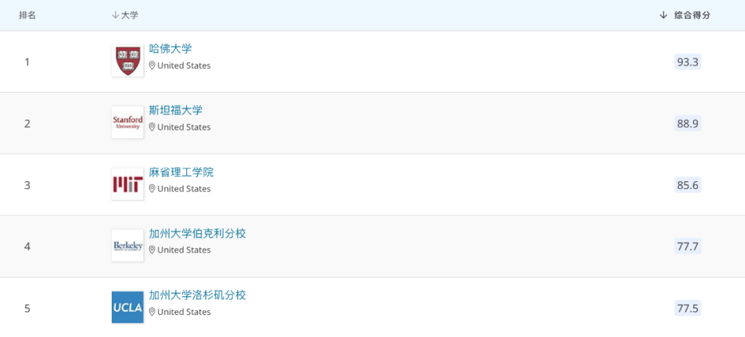 今年榜单前三名依旧是哈佛大学、斯坦福大学和麻省理工学院。