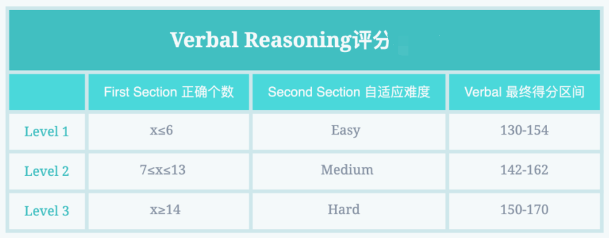 GRE考试是自适应考试 ,就是说会根据考生上个Section的完成情况,匹配下个Section的题目难度以及得分上限 。听起来云里雾里,但GRE评分也不是完全无迹可寻的,我们以Verbal为例: