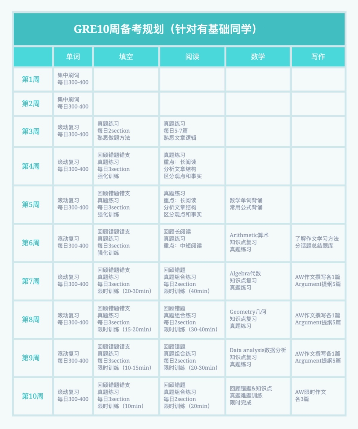 而且根据不同的基础,备考规划当然不同。所有不根据能力对应区分的备考规划都是耍流氓。 基础较好的考生 (四级600+;六级580+;托福105+;sat1550+)的备考时间建议在10周;而 基础较薄弱的考生 ,备考时间可安排为16-24周。