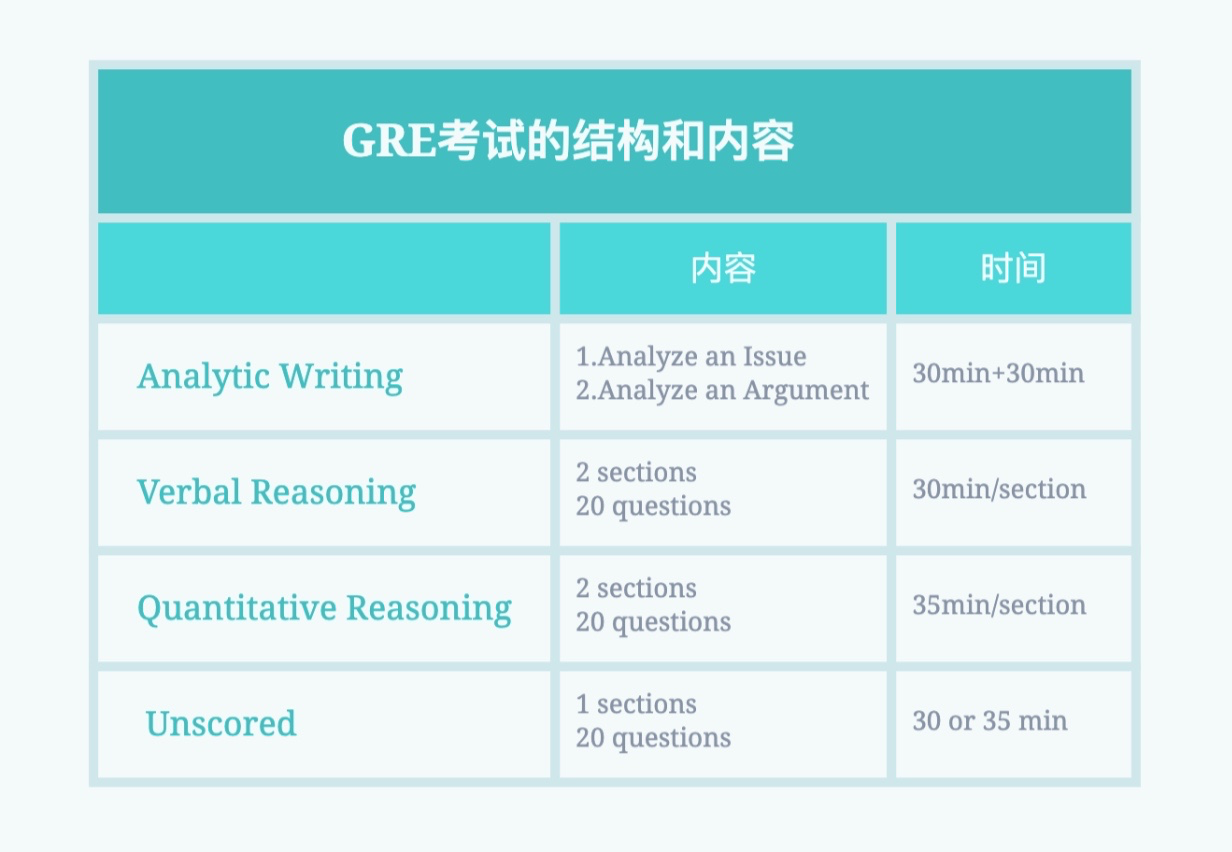 GRE General Test(以下简称为GRE考试)分为三个考察类别: Analytic Writing、Verbal Reasoning、Quantitive Reasoning 。具体内容和时间分配如下: