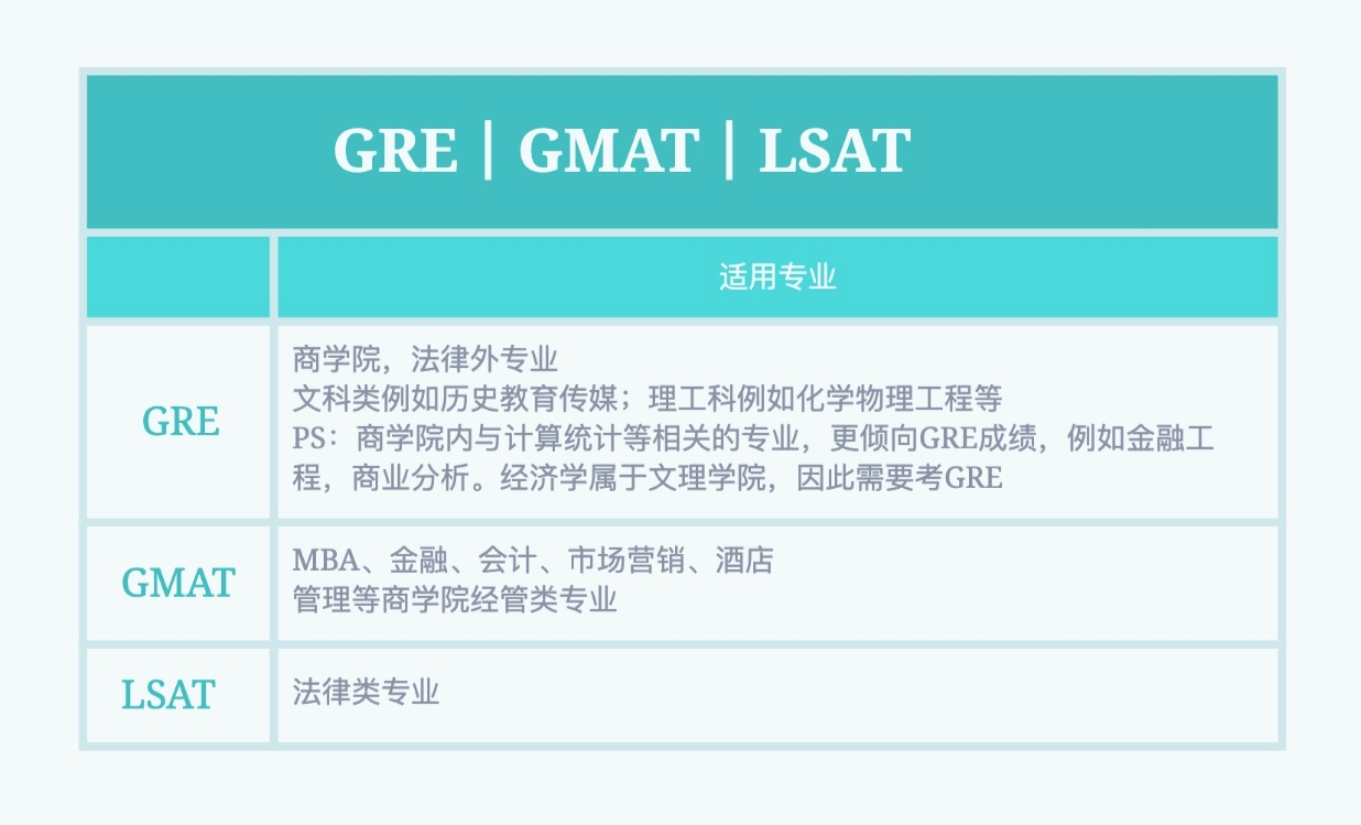 GRE、GMAT、LSAT适用于不同的美研专业,具体如下: