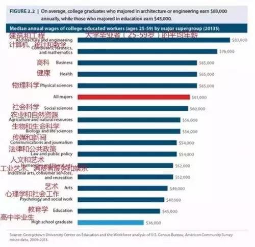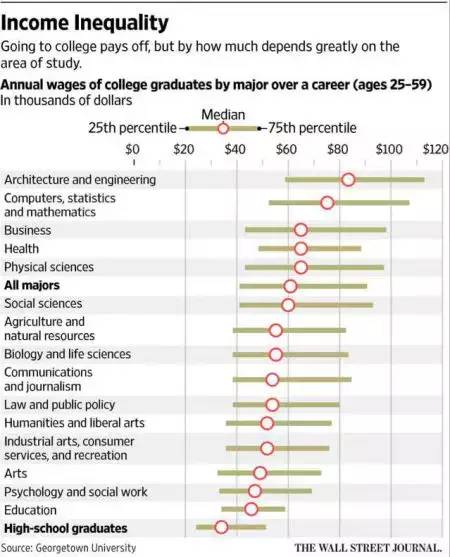 这份数据报告调查的是 25~59 岁人群的收入情况,其中薪水领先最为明显的就是建筑和工程相关职业人群,其次就是现在社会大受欢迎的计算机和统计学。