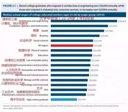 刚毕业起薪最高的其次是计算机类、健康类和商科,年薪分别是平均 43000 美元、 41000 美元、 37000 美元。