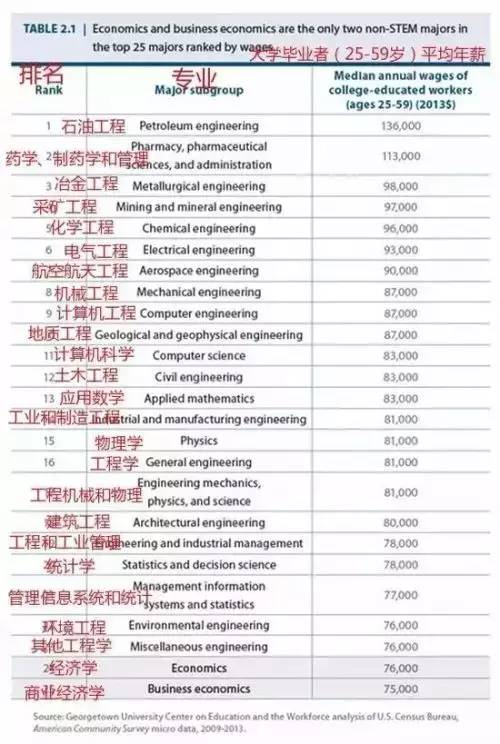 上图列出了平均年薪最高的 25 个专业,在各个专业的分支中,平均年薪占据首位的是工程类的石油工程。另外,不属于 STEM 专业的经济学和商业经济学分别位于 24 、 25 的位置, TOP25 的前 23 个都是 STEM 专业,果然是吸金界的扛把子。