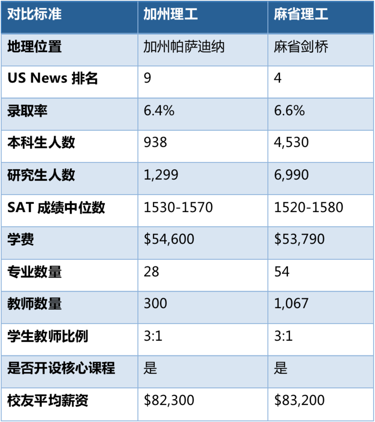 从表中可见,两所学校师生数量差别非常大。麻省理工的本科生和研究生数量都高于加州理工,虽然师生比例相同,但麻省理工的教师数量是加州理工的三倍。