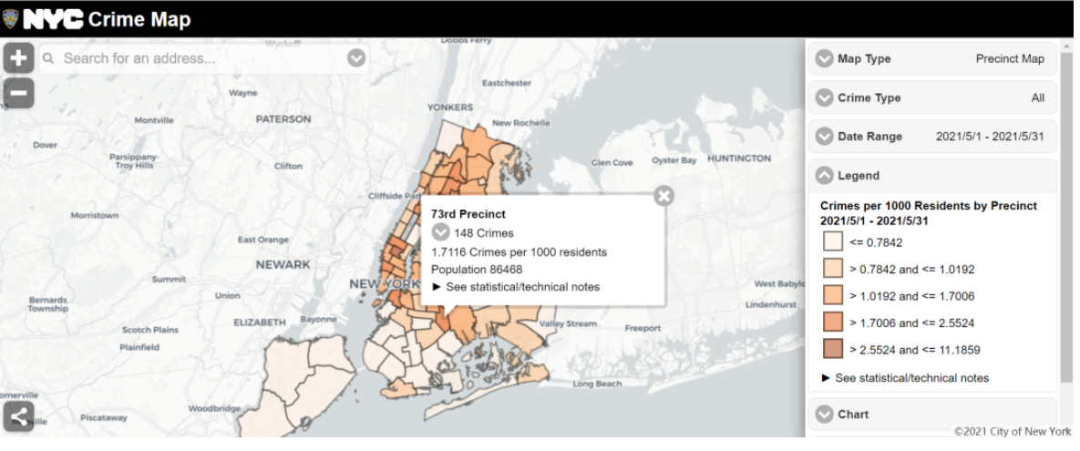 美国的中大型城市犯罪率数据都是公开的,可以直接在网上搜到。以纽约市为例,有个叫“NYC Crime Map”的网站可以看到纽约所有地区(精确到街道)的犯罪率数据,十分清晰明了。